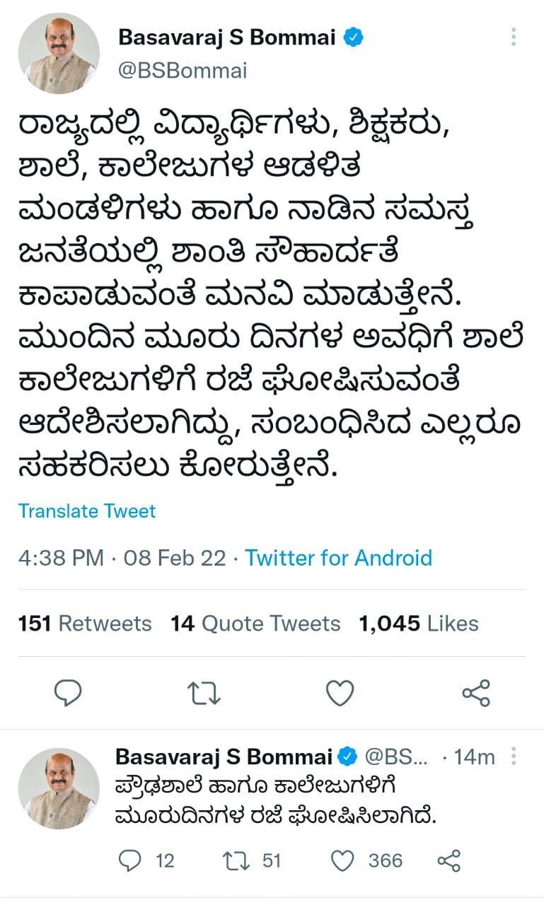 ವಿದ್ಯಾರ್ಥಿಗಳು, ಶಿಕ್ಷಕರು, ಶಿಕ್ಷಣ ಸಂಸ್ಥೆಗಳ ಆಡಳಿತ ಮಂಡಳಿ ಹಾಗೂ ರಾಜ್ಯದ ಸಮಸ್ತ ಜನತೆ ರಾಜ್ಯದಲ್ಲಿ ಶಾಂತಿ ಕಾಪಾಡಬೇಕು ಎಂದು ಸಿಎಂ ಮನವಿ ಮಾಡಿದ್ದಾರೆ.