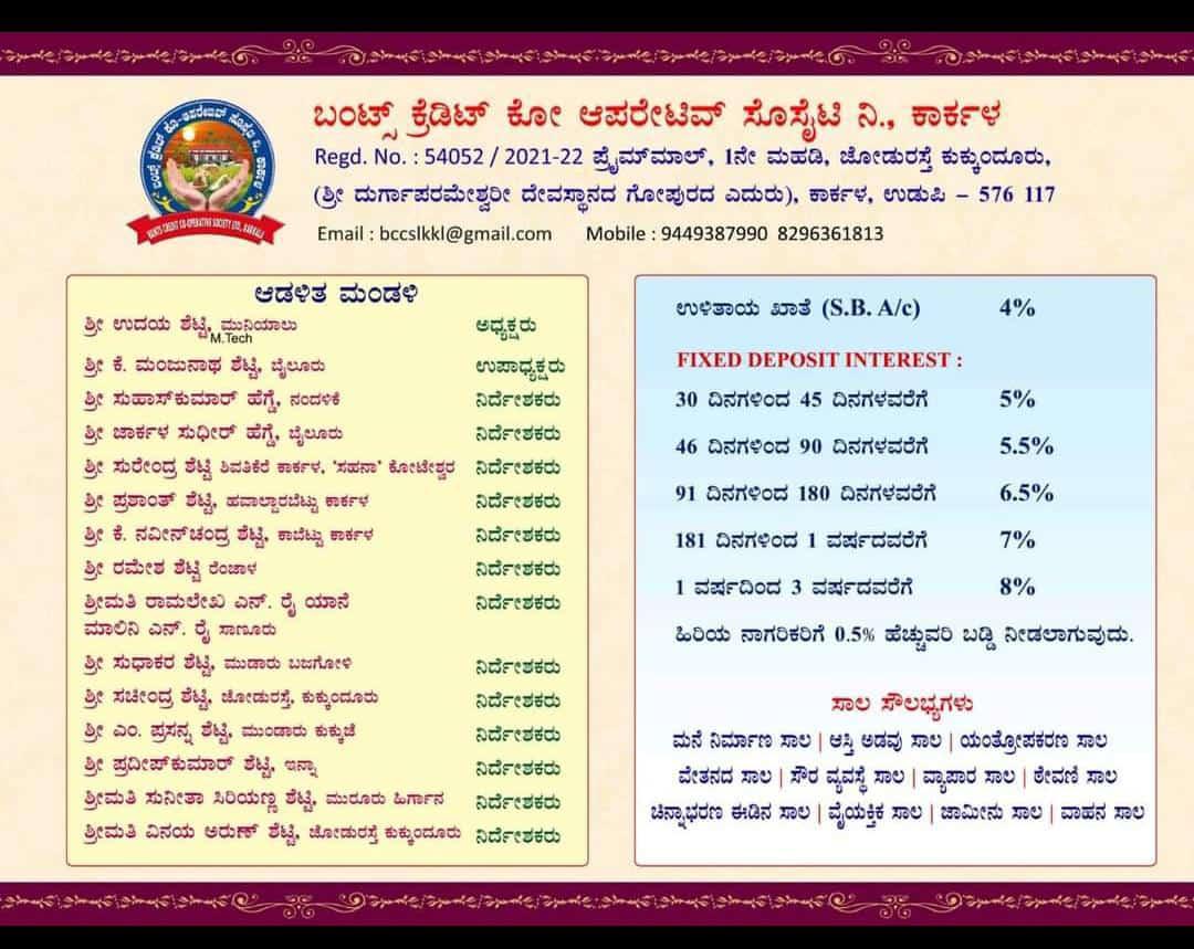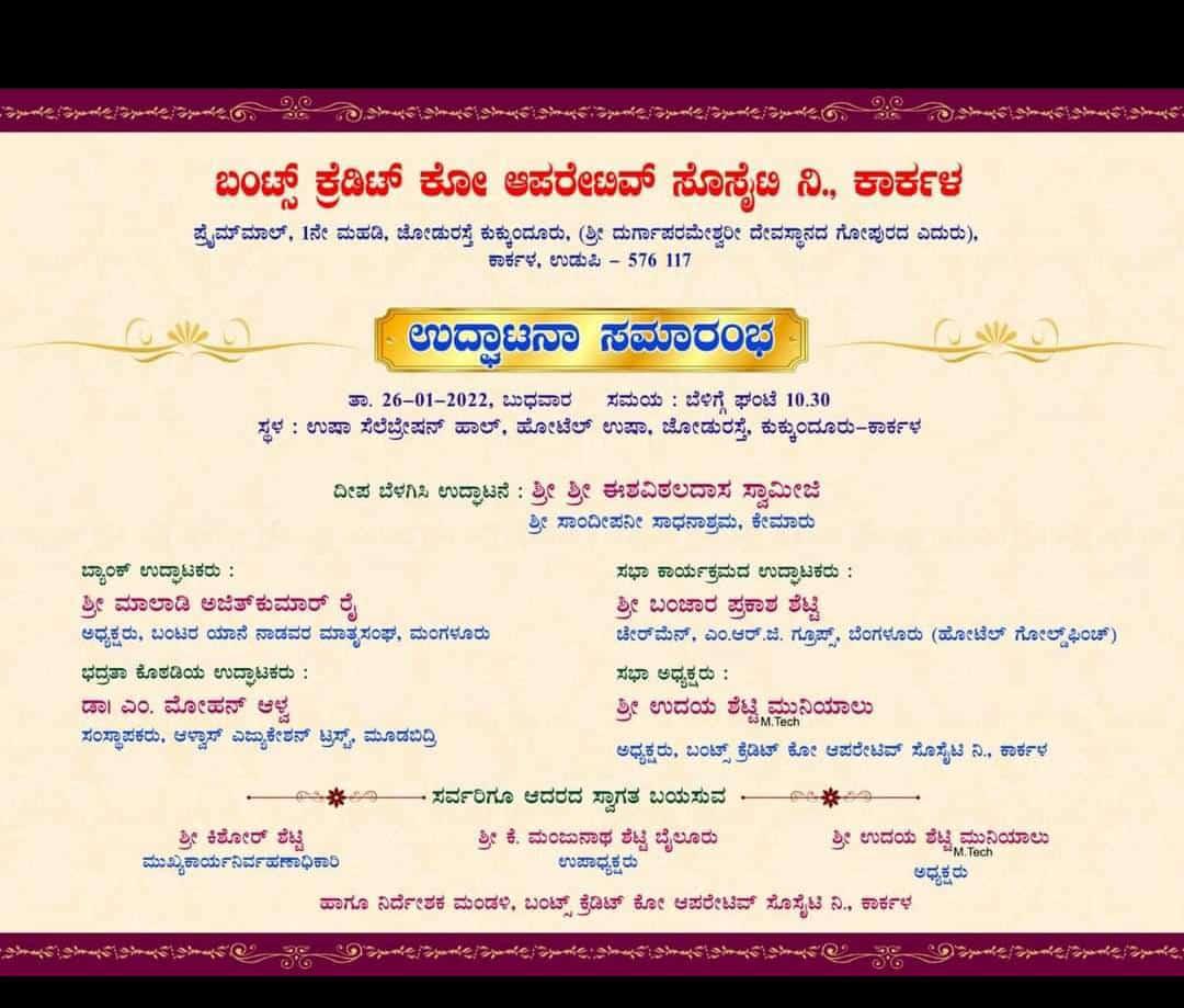 ಬಂಟರ ಯಾನೆ ನಾಡವರ ಮಾತೃ ಸಂಘದ ಅಧ್ಯಕ್ಷ ಮಾಲಾಡಿ ಅಜಿತ್ ಕುಮಾರ್ ರೈ ಬ್ಯಾಂಕ್ ಉದ್ಘಾಟಿಸಲಿರುವರು. ಎಂಆರ್ಜಿ ಗ್ರೂಪ್ಸ್ ಅಧ್ಯಕ್ಷ ಬಂಜಾರ ಪ್ರಕಾಶ ಶೆಟ್ಟಿ ಸಭಾ ಕಾರ್ಯಕ್ರಮ ಉದ್ಘಾಟಿಸಲಿದ್ದು, ಆಳ್ವಾಸ್ ಎಜ್ಯುಕೇಶನ್ ಟ್ರಸ್ಟ್ ಅಧ್ಯಕ್ಷ ಡಾ. ಎಂ. ಮೋಹನ್ ಆಳ್ವ ಭದ್ರತಾ ಕೊಠಡಿ ಉದ್ಘಾಟಿಸಲಿದ್ದಾರೆ. ಉದಯ ಶೆಟ್ಟಿ ಮುನಿಯಾಲು ಅಧ್ಯಕ್ಷತೆ ವಹಿಸಲಿರುವರು. ಉಪಾಧ್ಯಕ್ಷ ಕೆ. ಮಂಜುನಾಥ ಶೆಟ್ಟಿ ಬೈಲೂರು, ಮುಖ್ಯಕಾರ್ಯನಿರ್ವಹಣಾಧಿಕಾರಿ ಕಿಶೋರ್ ಶೆಟ್ಟಿ ಸೇರಿದಂತೆ ಅನೇಕ ಗಣ್ಯರು ಉಪಸ್ಥಿತರಿರುವರು ಎಂದು ಸಂಸ್ಥೆ ಪ್ರಕಟನೆಯಲ್ಲಿ ತಿಳಿಸಿದೆ.