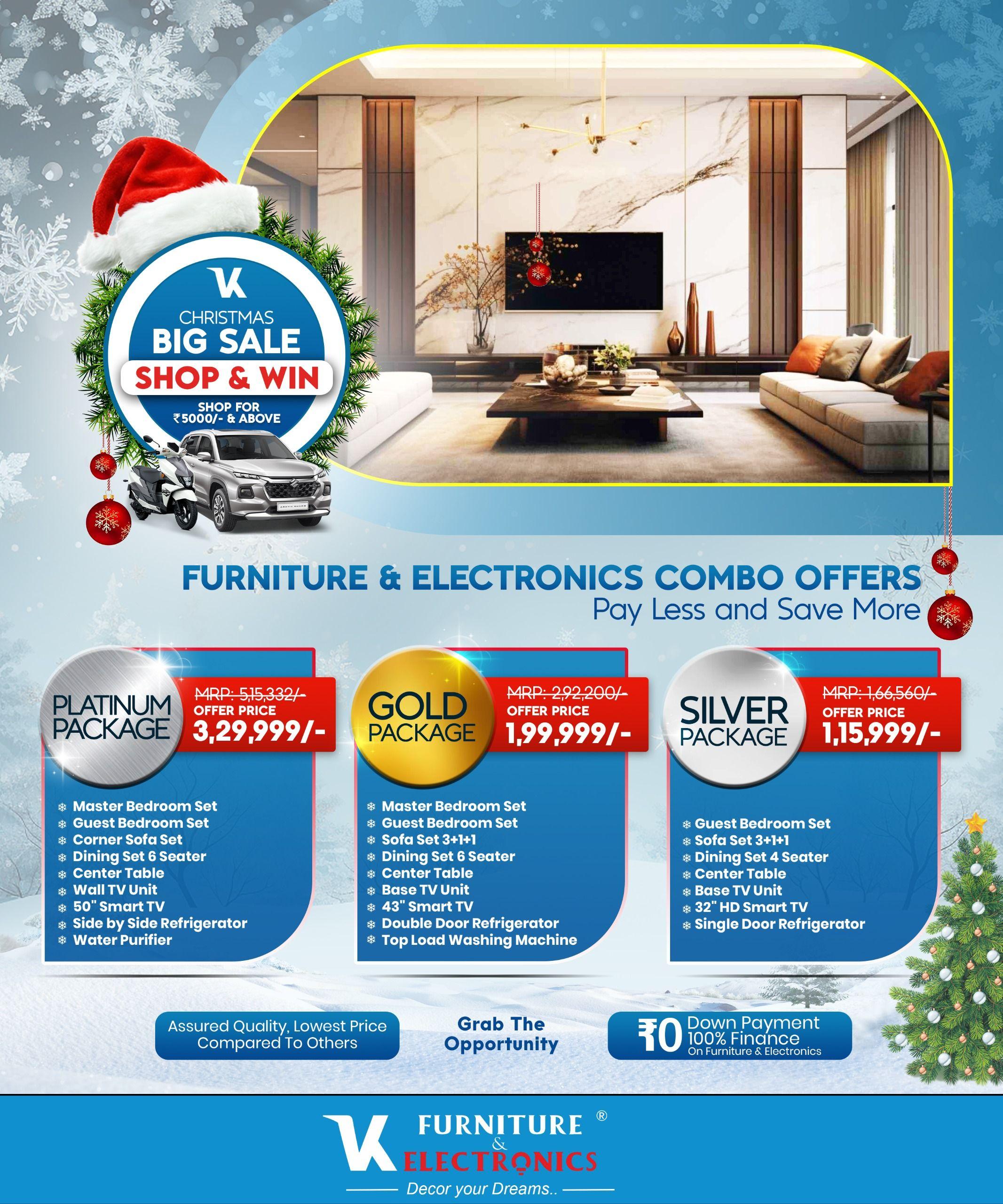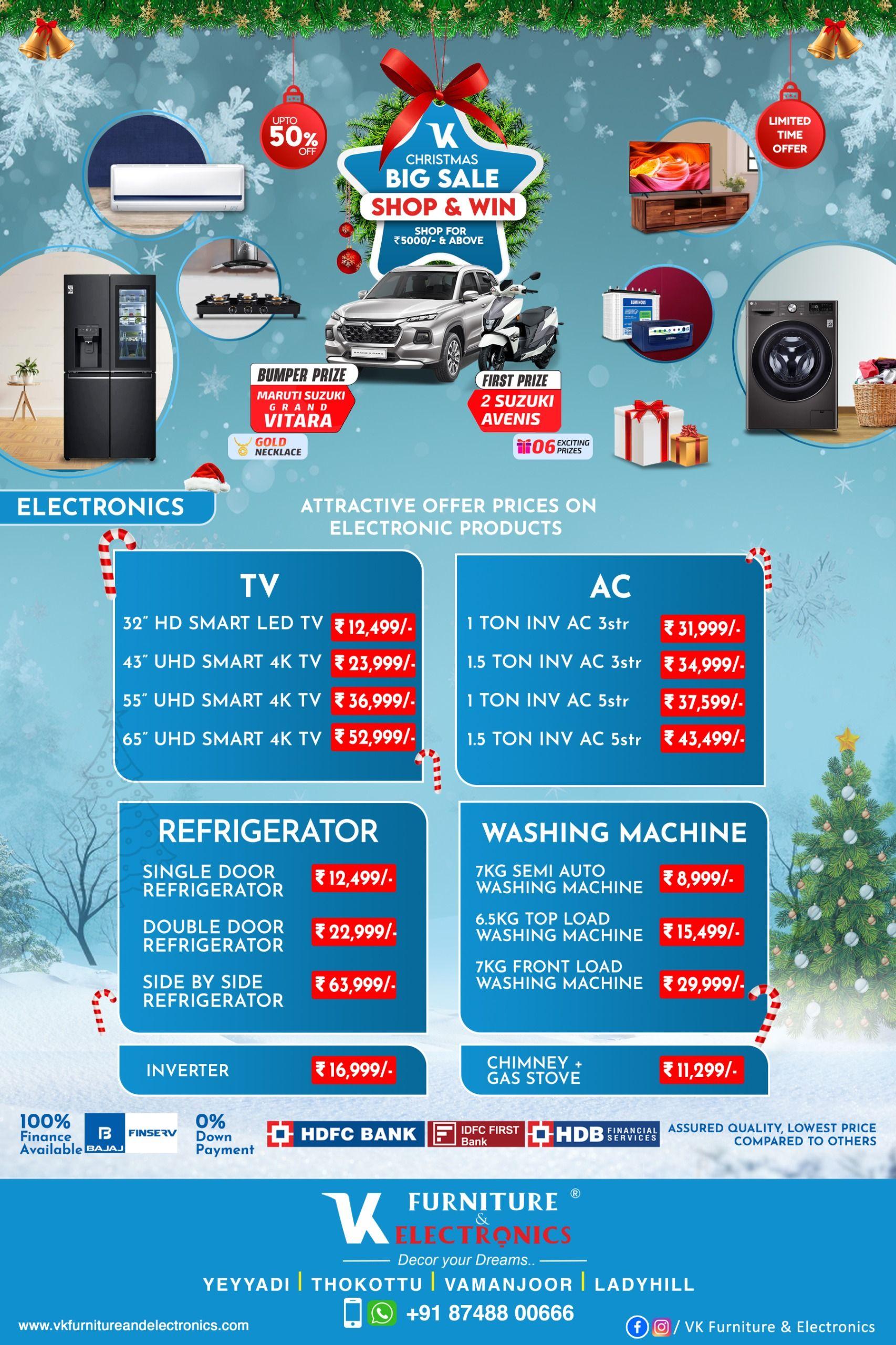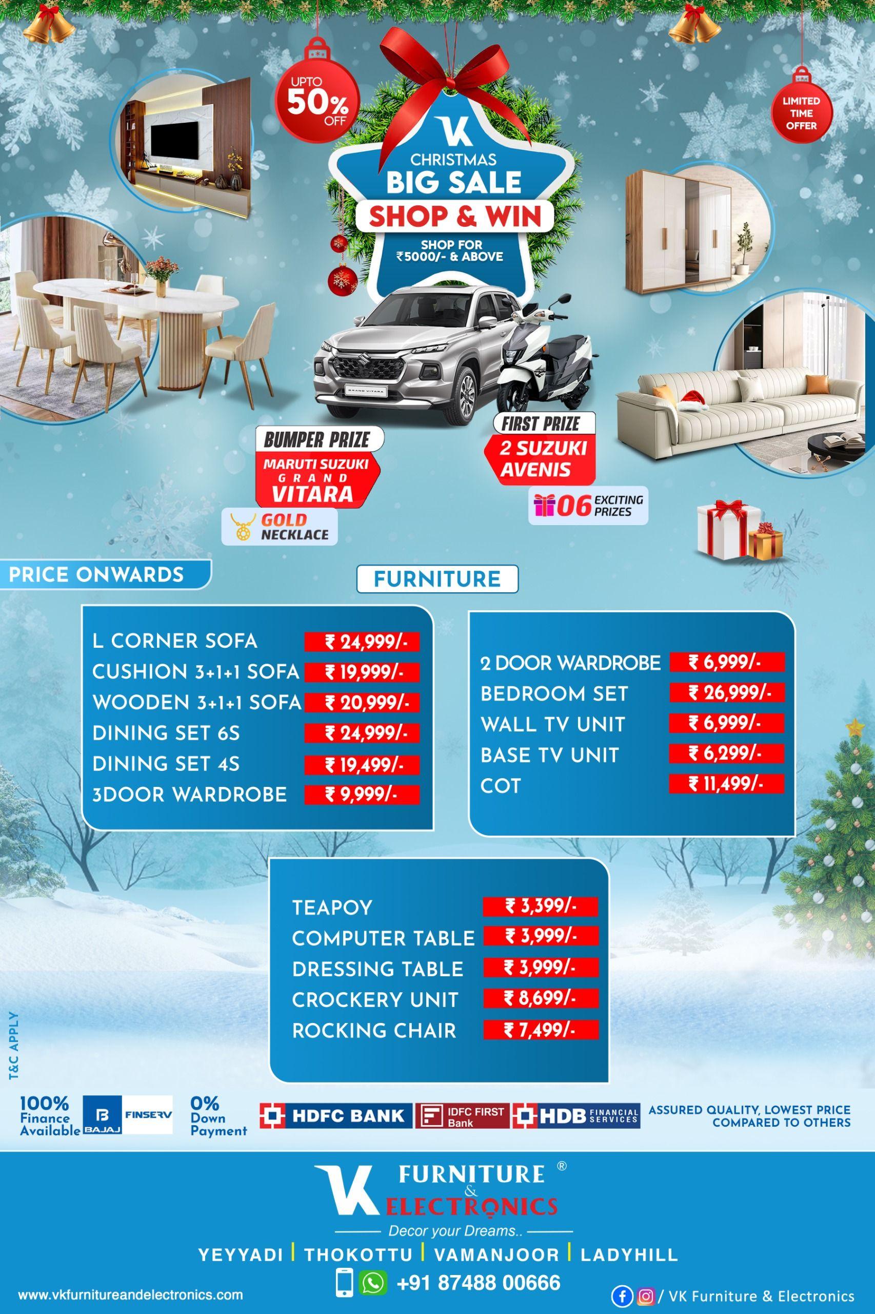 ಮಂಗಳೂರಿನ ಯೆಯ್ಯಡಿ ತೊಕ್ಕೊಟ್ಟು , ವಾಮಂಜೂರ್ ಲೇಡಿಹಿಲ್ ನಲ್ಲಿರುವ ಪ್ರಸಿದ್ದ ಪೀಠೋಪಕರಣಗಳು ಮತ್ತು ಎಲೆಕ್ಟ್ರಾನಿಕ್ಸ್ ಮಳಿಗೆಯಾಗಿರುವ ವಿಕೆ ಫರ್ನಿಚರ್ಸ್ ನಲ್ಲಿ ಕ್ರಿಸ್ಮಸ್ ಮತ್ತು ಹೊಸ ವರ್ಷದ ಪ್ರಯುಕ್ತ ಭರ್ಜರಿ ಆಗಿರುವ ಆಫರ್ ಗಳನ್ನು ನೀಡಲಾಗುತ್ತಿದೆ. ಶಾಪಿಂಗ್ ಮಾಡಿ ಮತ್ತು ಭರ್ಜರಿ ಬಹುಮಾನ ಗೆಲ್ಲುವ ಅವಕಾಶವಿದು! ಹೌದು ಇಲ್ಲಿ ₹5000/- ಮತ್ತು ಅದಕ್ಕಿಂತ ಹೆಚ್ಚಿನ ಬೆಲೆಗೆ ಶಾಪಿಂಗ್ ಮಾಡಿದರೆ ಗ್ರಾಹಕರು 50% ಆಫ್ ಪಡೆಯೋದು ಮಾತ್ರವಲ್ಲ ಬಂಪರ್ ಬಹುಮಾನ ಗೆಲ್ಲಬಹುದು. ಮಾರುತಿ ಸುಜುಕಿ ಗ್ರ್ಯಾಂಡ್ ವಿತಾರಾ ಮೊದಲ ಬಹುಮಾನ 2 ಸುಜುಕಿ AVENIS, ಚಿನ್ನದ ನೆಕ್ಲೇಸ್ ಮತ್ತು 6 ಅತ್ಯಾಕರ್ಷಕ ಬಹುಮಾನಗಳನ್ನು ಗೆಲ್ಲುವ ಅದ್ಬುತ ಅವಕಾಶ ಇಲ್ಲಿನ ಗ್ರಾಹಕರದ್ದು! ಇದು ಲಿಮಿಟೆಡ್ ಸಮಯದ ಆಫರ್ ಆಗಿದ್ದು ಗ್ರಾಹಕರು ಮಳಿಗೆಗೆ ಭೇಟಿ ಉತ್ಪನ್ನಗಳನ್ನು ಖರೀದಿಸುವುದರ ಜೊತೆಗೆ ಕ್ರಿಸ್ ಮಸ್ ಮತ್ತು ಹೊಸ ವರ್ಷವನ್ನು ಖುಷಿಯಿಂದ ಆನಂದಿಸಬಹುದು!